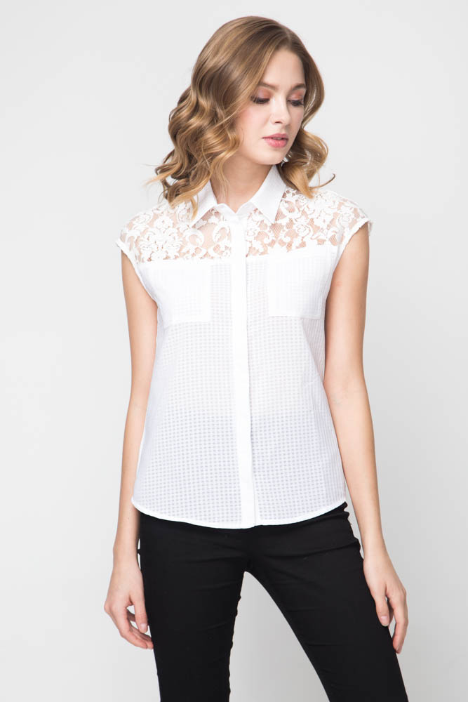 Легкая блузка с кружевом и двумя карманами на груди станет незаменимой вещью для летнего сезона. Элегантный воротник придает деловой стиль данной модели блузки, позволяя смело одевать ее в офис. Выберите свою блузку среди пяти представленных цветов данной модели.